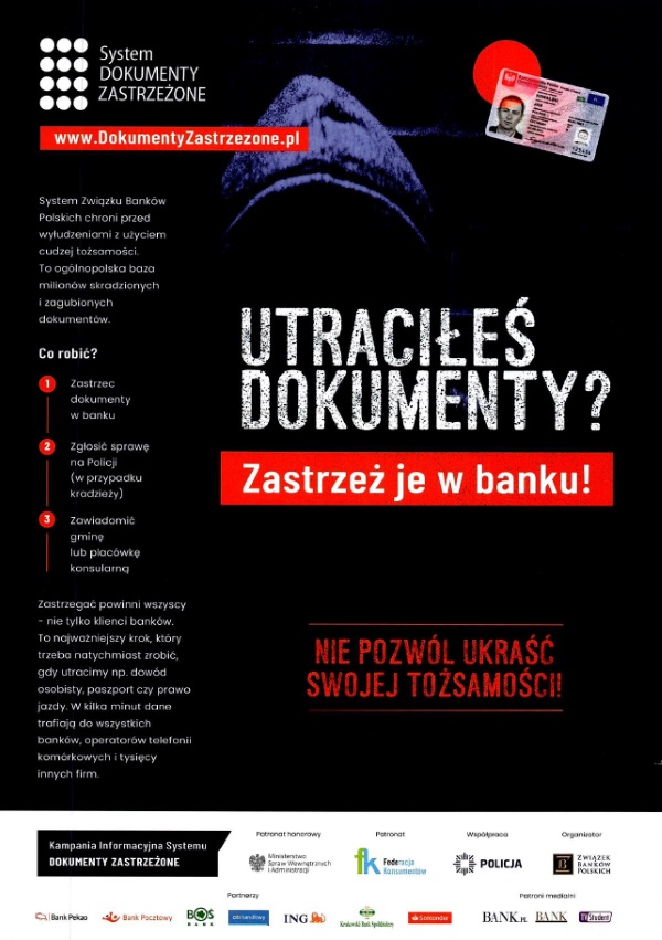 Kradzież albo zagubienie dowodu osobistego, prawa jazdy czy innych dokumentów tożsamości to bardzo poważny problem mogący doprowadzić do szeregu trudnych do wyjaśnienia sytuacji z wykorzystaniem naszych danych do celów przestępczych. Policjanci wspierają aktywnie ogólnopolską kampanię informacyjną systemu „Dokumenty Zastrzeżone” prowadzoną przez Związek Banków Polskich.