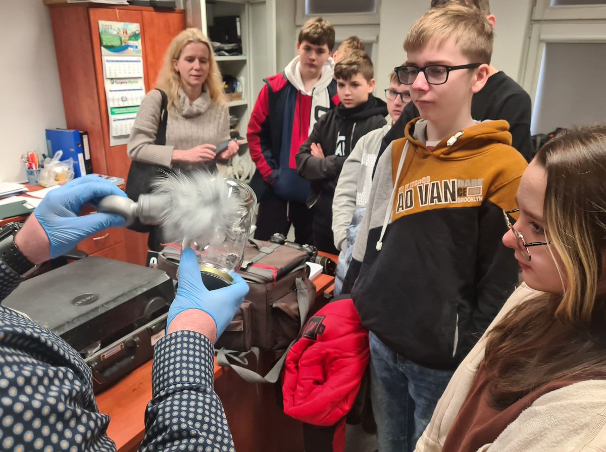 Uczniowie mieli możliwość zapoznania się pracą technika kryminalistyki. Dowiedzieli się przy tym na czym polega jego praca, jakich narzędzi używa oraz jak zabezpiecza ślady na miejscu przestępstwa. Największe zainteresowanie wzbudziło wśród młodych ludzi pomieszczenie z lustrem fenickim do okazywania osób podejrzanych i możliwość zrobienia przez nich swoich własnych odcisków palców.