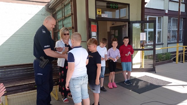 Wczoraj budynek nowomiejskiej komendy Policji odwiedzili uczniowie klasy I Szkoły Podstawowej im. ks. Kazimierza Wróblewskiego z Gwiździn. Podczas wizyty policjantka przeczytała dzieciom książkę Ralfa Butschkowa pt. „Mam przyjaciela policjanta”. Opowiedziała przy tym o swojej pracy tłumacząc, że policjant to osoba, która pomaga, gdy ktoś tej pomocy potrzebuje. Przedstawiła dzieciom także podstawowe zasady bezpieczeństwa promując noszenie odblasków. Dzielnicowa st. asp. Dorota Kaczmarska pokazała uczniom policyjny radiowóz, do którego każdy mógł wejść i choć przez chwilę poczuć się stróżem prawa w niebieskim mundurze. Pierwszoklasiści mogli przymierzyć elementy policyjnego umundurowania a na zakończenie otrzymali prezent - worki odblaskowe.