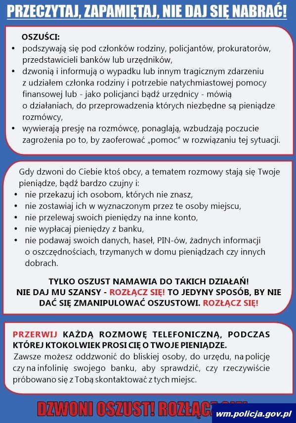Kolejny raz apelujemy o rozsądek i szczególną ostrożność podczas rozmów telefonicznych z osobami, które podają się za pracownika banku, policjanta czy inną osobę i informują nas o próbie oszustwa na naszym koncie bankowym. Pamiętajmy, że gdy pracownik banku prosi nas o podanie przez telefon danych uwierzytelniających do bankowości elektronicznej, czy danych kart płatniczy albo namawia do instalacji dodatkowych aplikacji, to mamy do czynienia z oszustem.