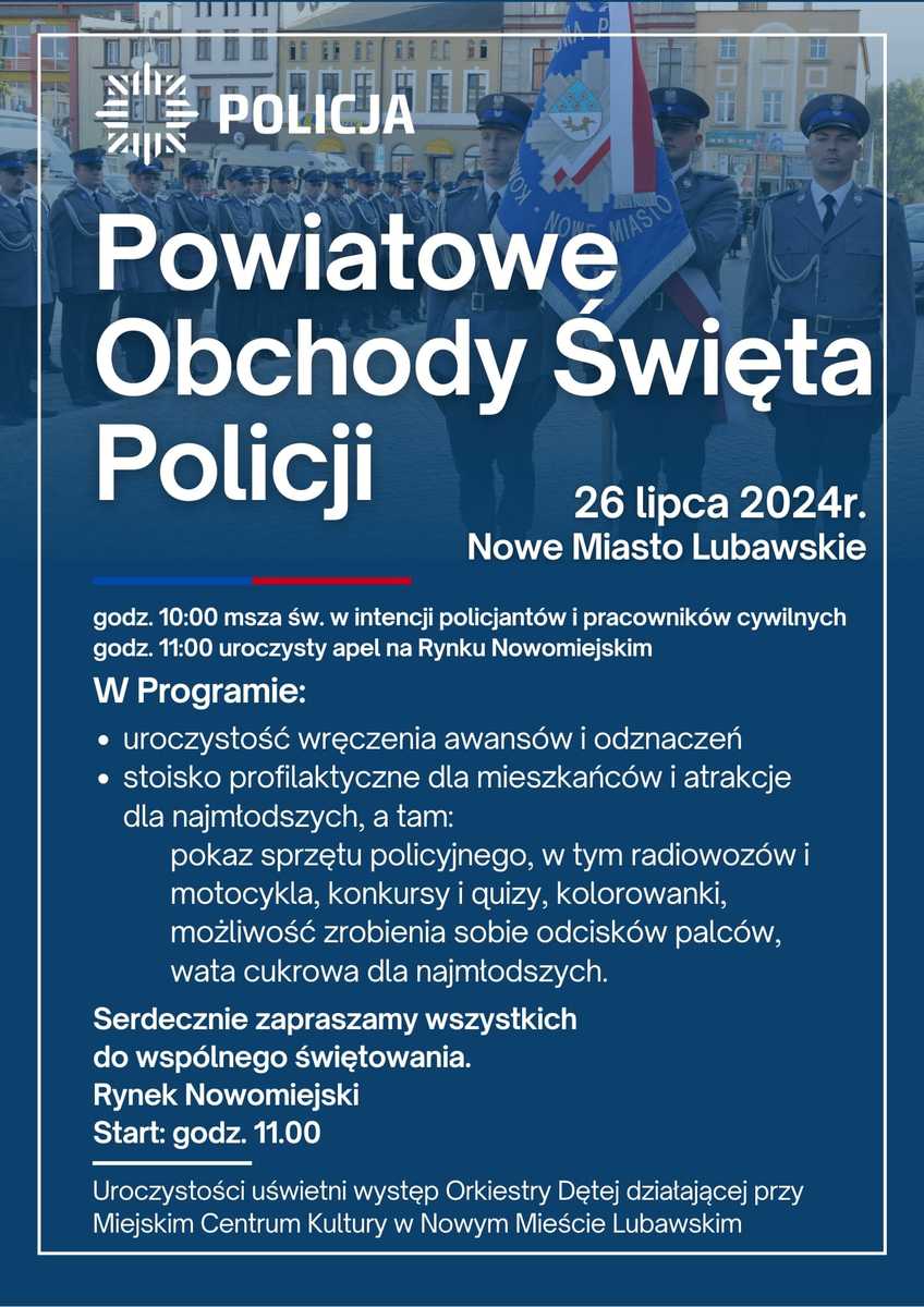 Komendant Powiatowy Policji w Nowym Mieście Lubawskim zaprasza na uroczyste obchody Święta Policji w dniu 26.07.2024 r. o godz. 11:00 na Rynku Nowomiejskim . Uroczystość ta będzie znakomitą okazją do poznania bliżej pracy Policji.