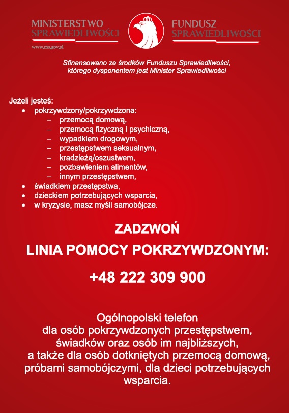 Policjanci informują o funkcjonowaniu Linii Pomocy Pokrzywdzonym jako wsparcie dla osób pokrzywdzonych przestępstwem, świadków przestępstw oraz osób najbliższych. Linia finansowana jest ze środków Funduszu Pomocy Pokrzywdzonym oraz Pomocy Postpenitencjarnej – Funduszu Sprawiedliwości w zakresie Wsparcia i rozwoju instytucjonalnego systemu pomocy osobom pokrzywdzonym przestępstwem i świadkom.