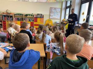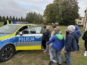 W miniony piątek (10.10.25r.) uczniów klas I a i III b odwiedził asp. Waldemar Kroplewski- policjant pracujący w Wydziale Ruchu Drogowego Komendy Powiatowej Policji w Nowym Mieście Lubawskim. Pan policjant zapoznał dzieci z codzienną policyjną służbą, zadaniami i obowiązkami.