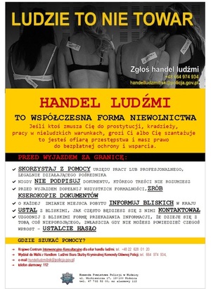 Zjawisko handlu ludźmi może dotknąć każdego, bez względu na płeć czy wiek. Grupy przestępcze zajmujące się handlem ludźmi wykorzystują różne metody, aby zwerbować osoby szukające pracy. Także o problemie, jakim jest handel ludźmi, należy pamiętać każdego dnia, nie tylko w okresie wakacji czy urlopów. Warto więc wiedzieć jak ustrzec się przed takimi zjawiskami i gdzie udać się po pomoc, aby walczyć z procederem handlu ludźmi.