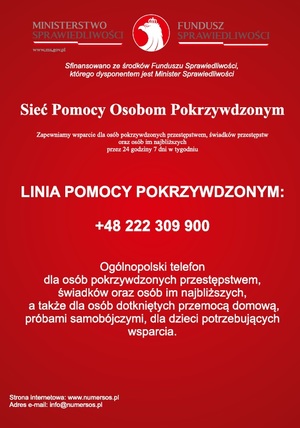 Policjanci informują o funkcjonowaniu Linii Pomocy Pokrzywdzonym jako wsparcie dla osób pokrzywdzonych przestępstwem, świadków przestępstw oraz osób najbliższych. Linia finansowana jest ze środków Funduszu Pomocy Pokrzywdzonym oraz Pomocy Postpenitencjarnej – Funduszu Sprawiedliwości w zakresie Wsparcia i rozwoju instytucjonalnego systemu pomocy osobom pokrzywdzonym przestępstwem i świadkom.